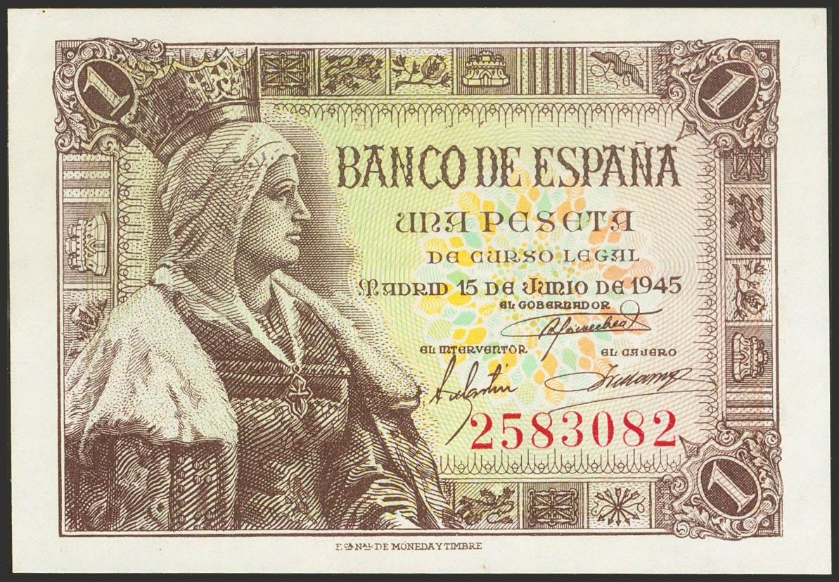 1 Peseta. June 15, 1945. No series. (Edifil 2021: 448). Original sizing. Almost Uncirculated.