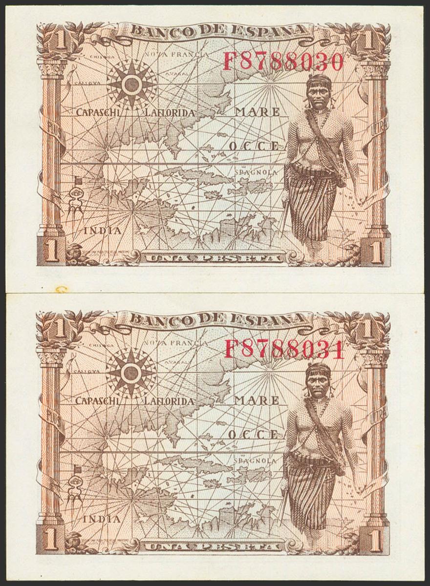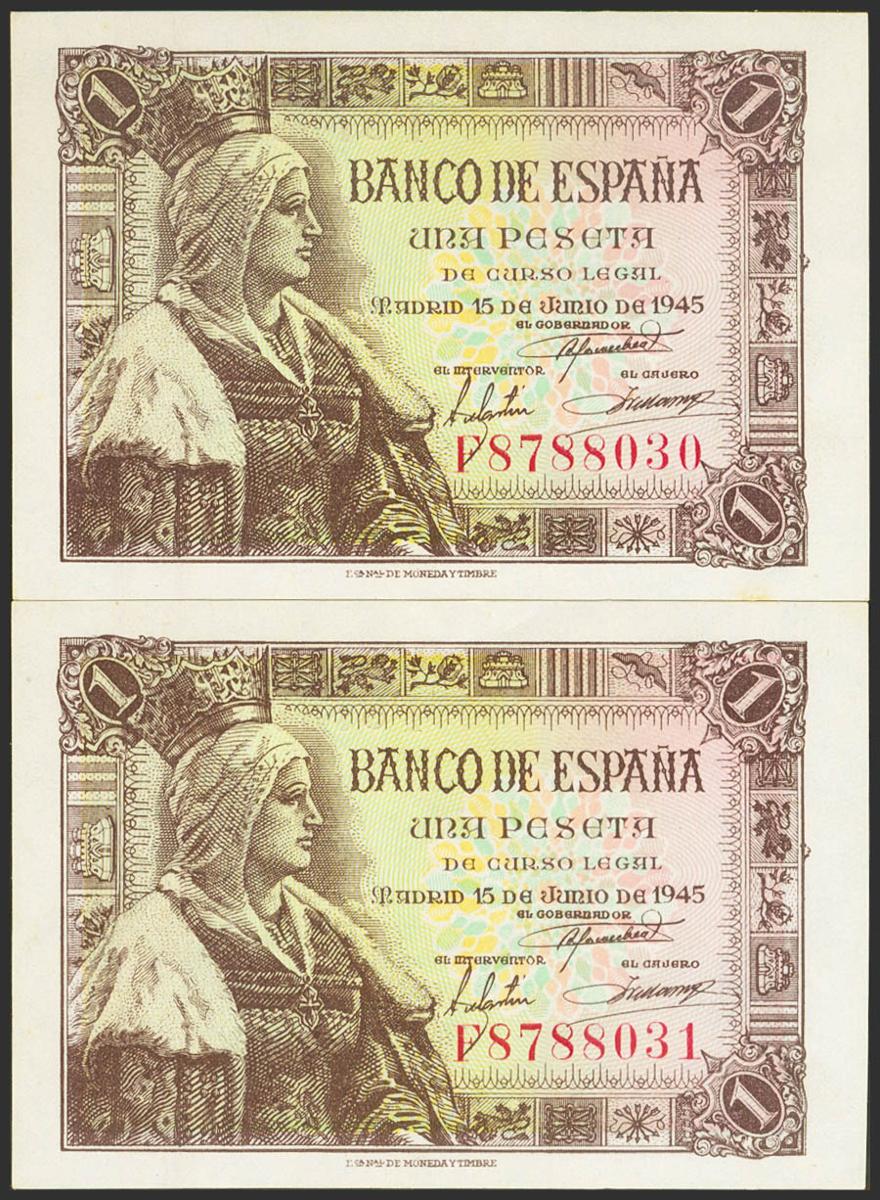 1 Peseta. June 15, 1945. Correlative couple. Series F. (Edifil 2021: 448a). Original sizing. Uncirculated/ Almost Uncirculated.