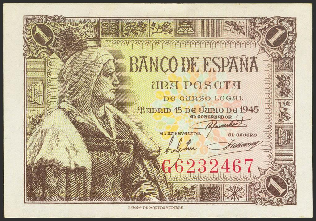 English 1 Peseta. June 15, 1945. Series G. (Edifil 2021: 448a). Original sizing. Good Extremely Fine.