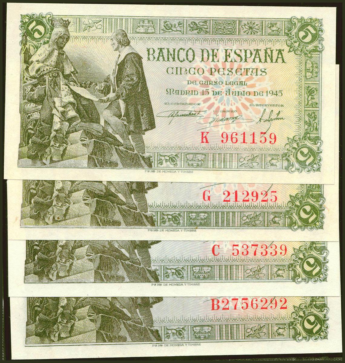 Set of 4 5 Pesetas banknotes issued on June 15, 1945 with series B, C, G and K, respectively (Edifil 2021: 449a), preserving much of their original size. Extremely Fine.
