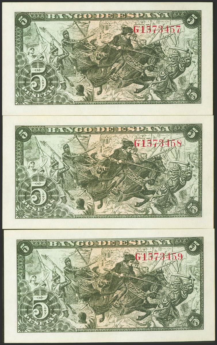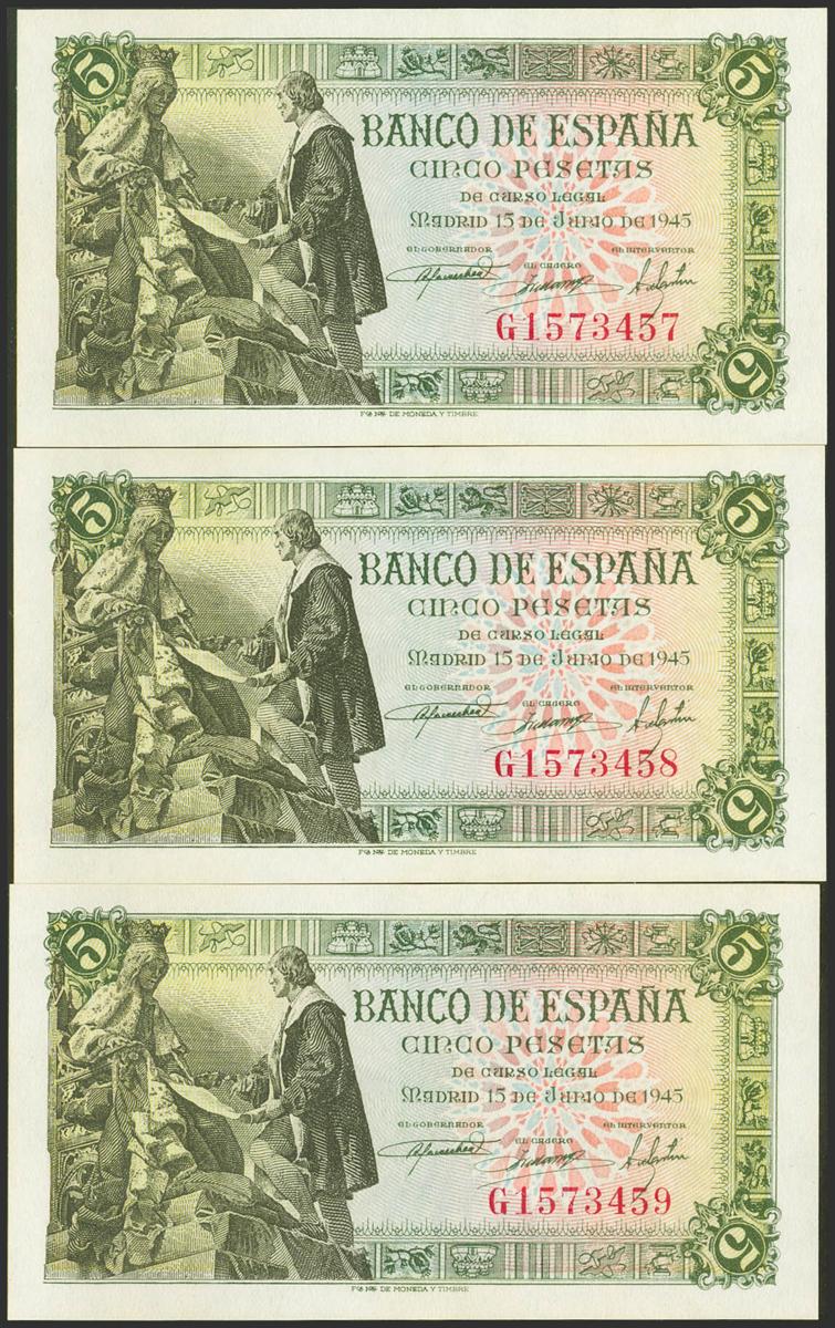5 Pesetas. June 15, 1945. Correlative trio. Series G. (Edifil 2021: 449a). Original sizing. Uncirculated.