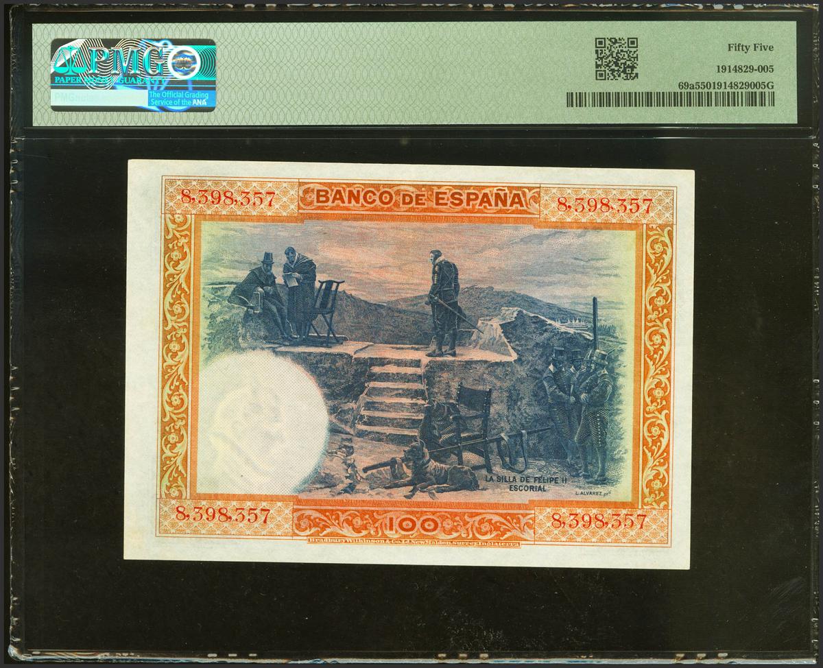 100 Pesetas. July 1, 1925. No series. (Edifil 2021: 323). Unusual, especially in this quality. Good Extremely Fine. PMG55 encapsulation.
