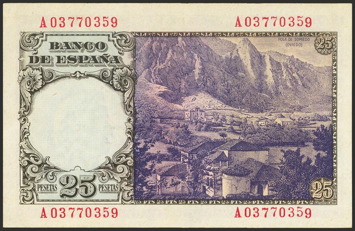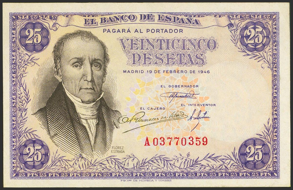 English 25 Pesetas. February 19, 1946. Series A. (Edifil 2021: 450a). Original sizing. EBC++.