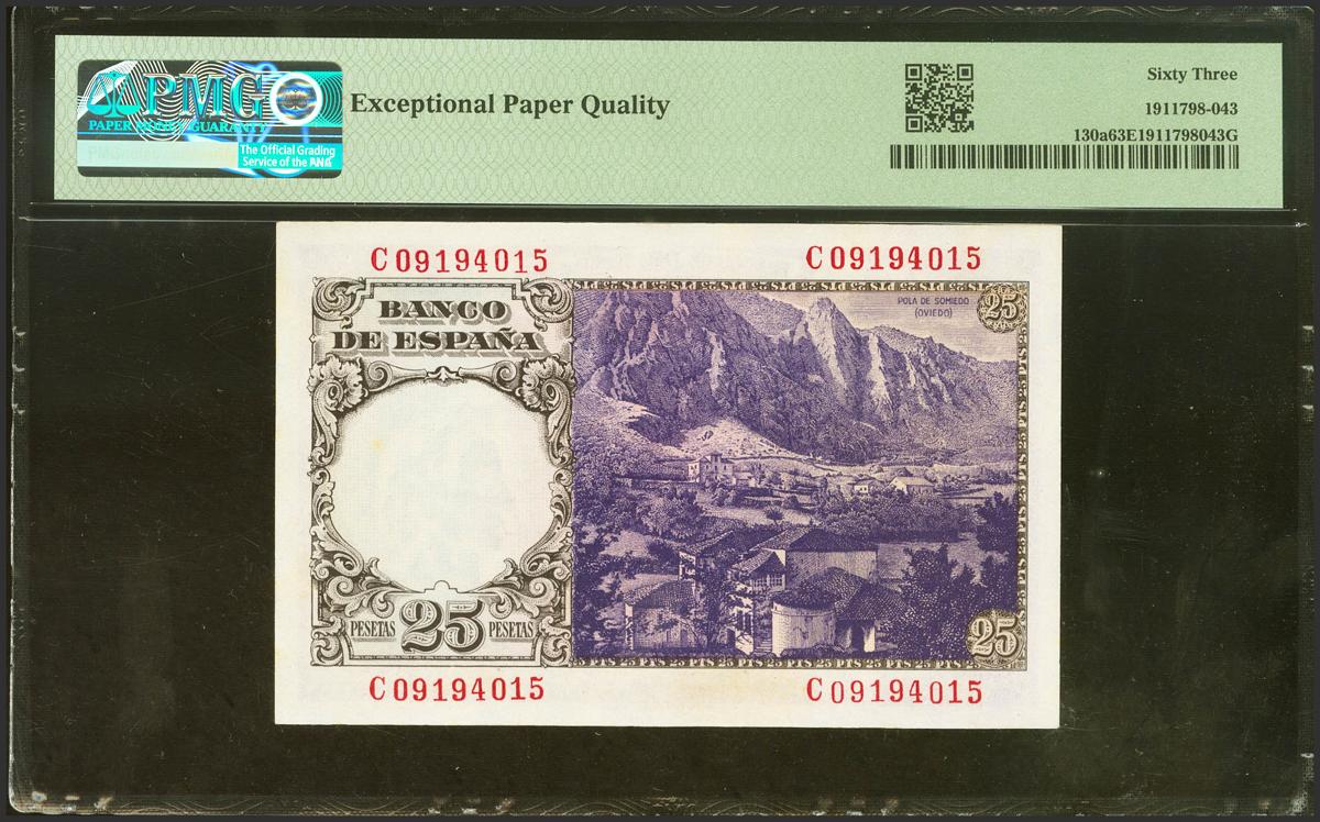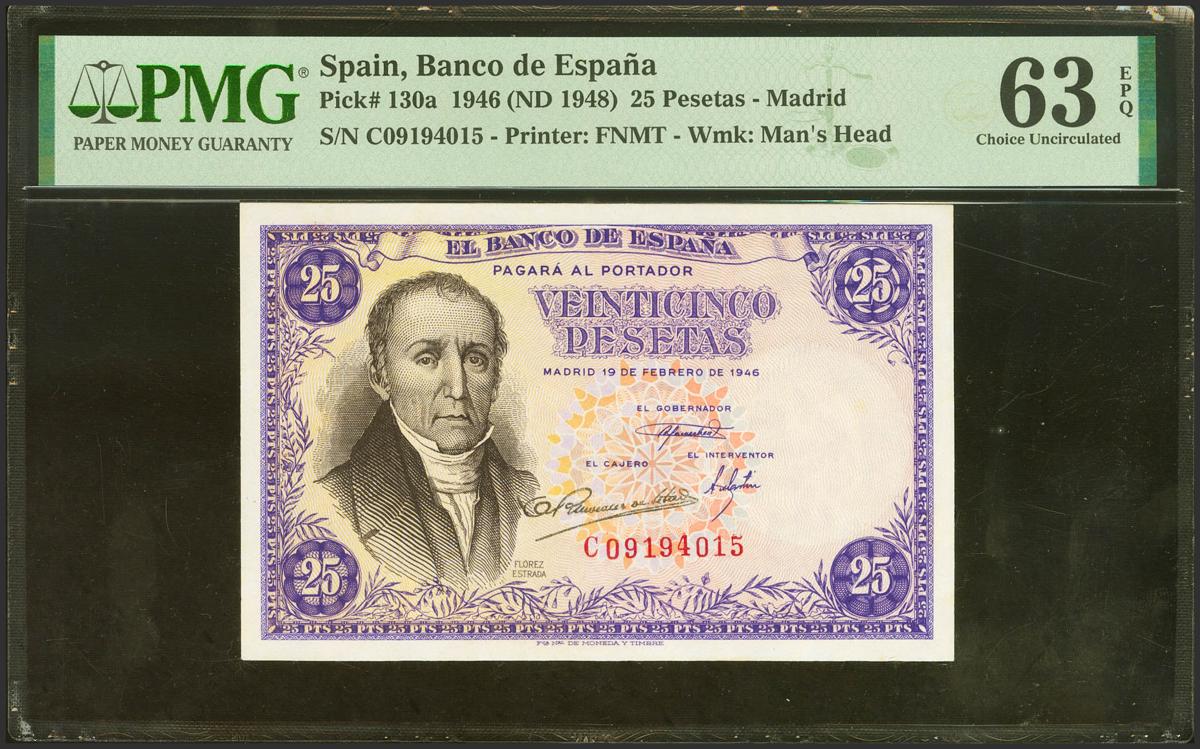 25 Pesetas. February 20, 1946. Series C. (Edifil 2021: 450a, Pick: 130a). Original sizing. Uncirculated. PMG63EPQ package.