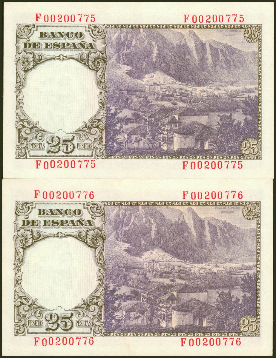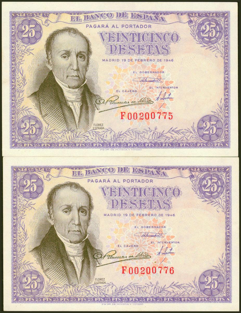 25 Pesetas. February 19, 1946. Correlative couple. Series F. (Edifil 2021: 450a). Original sizing. Good Extremely Fine.