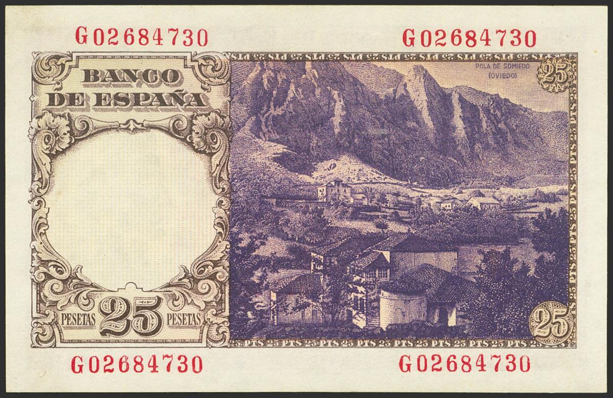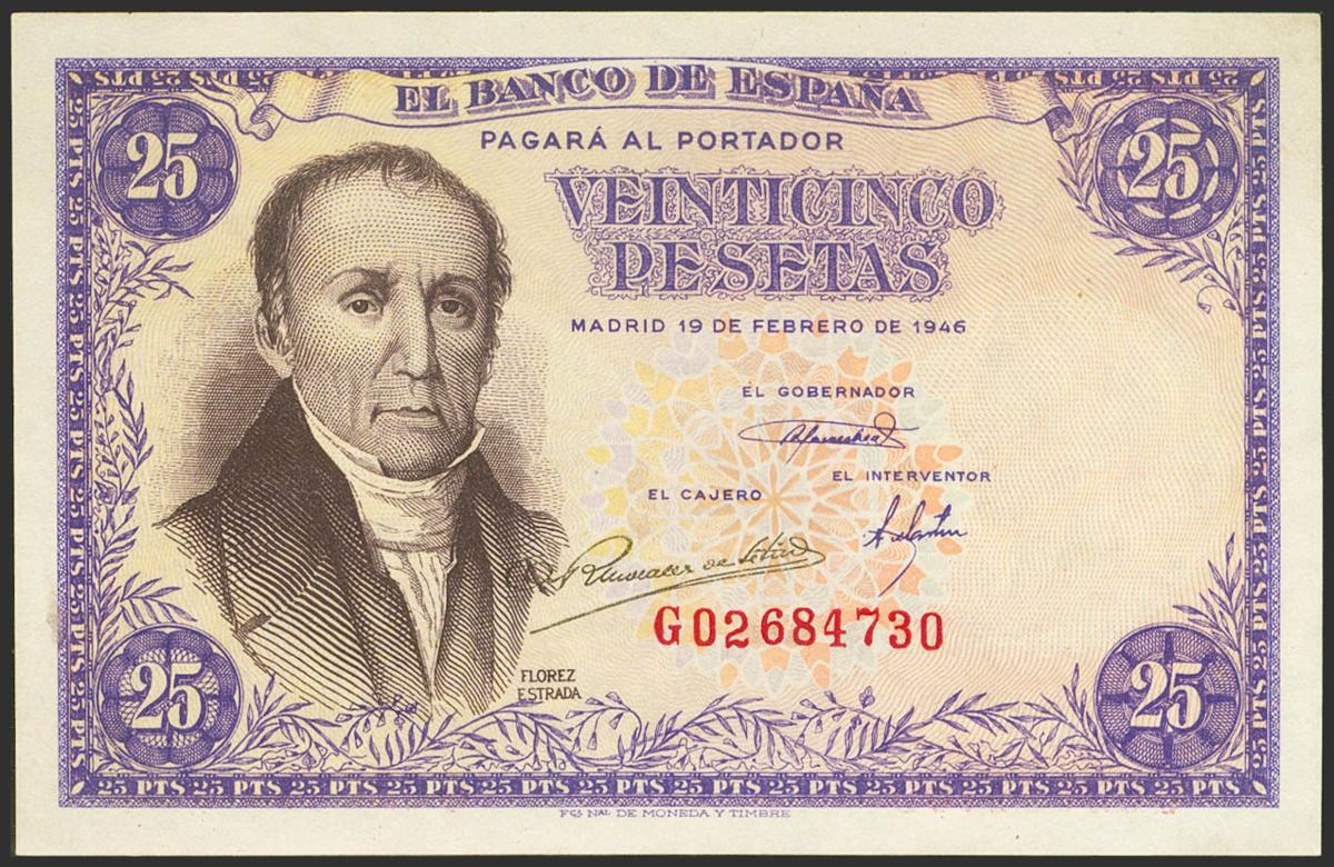 25 Pesetas. February 19, 1946. Series G. (Edifil 2021: 450a). It retains much of its original finish. EBC+++.