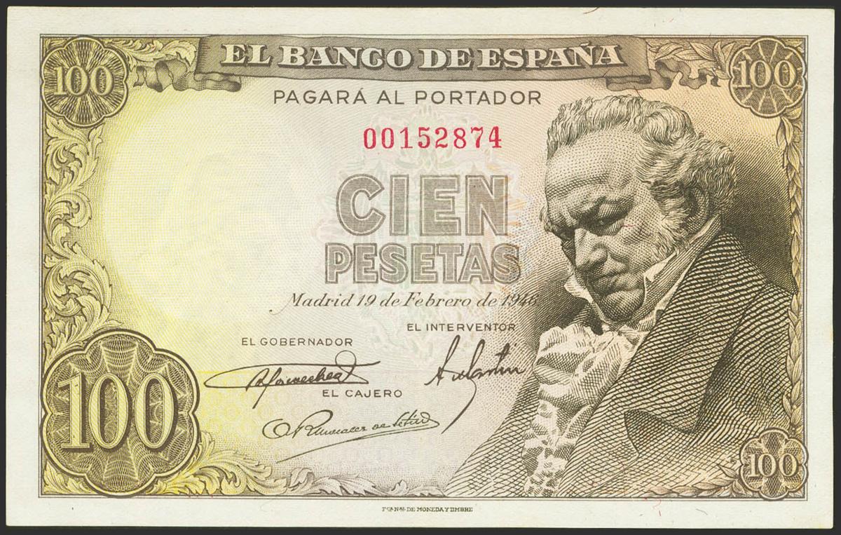 English 100 Pesetas. February 19, 1946. No series. (Edifil 2021: 451). Almost Extremely Fine.