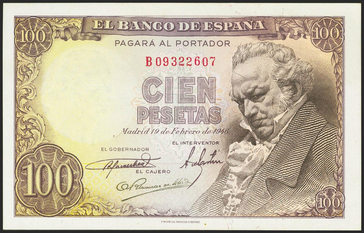 100 Pesetas. February 19, 1946. Series B, last series issued. (Edifil 2021: 451b). Original sizing. Almost Uncirculated.