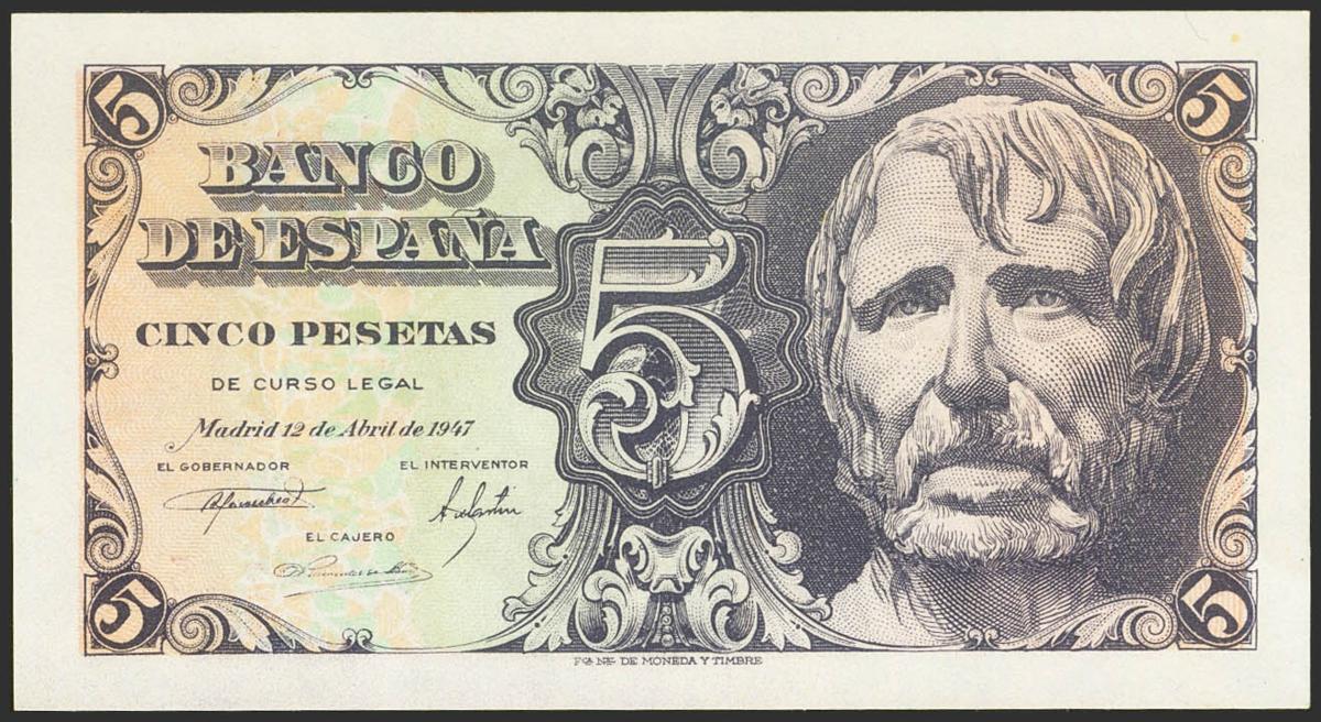 English 5 Pesetas. April 12, 1947. Series C. (Edifil 2021: 454a). It retains part of the original finish. Almost Uncirculated.
