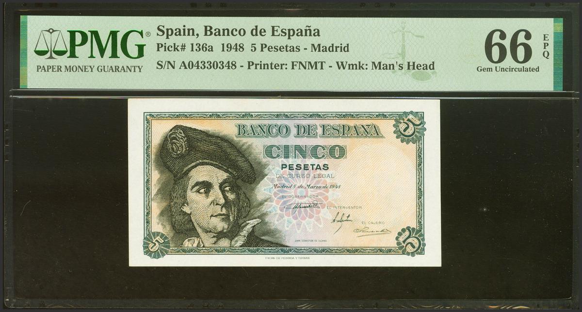 5 Pesetas. April 12, 1947. Series A. (Edifil 2021: 455a, Pick: 136a). Rare in this exceptional quality, original sizing. Uncirculated. PMG66EPQ package.