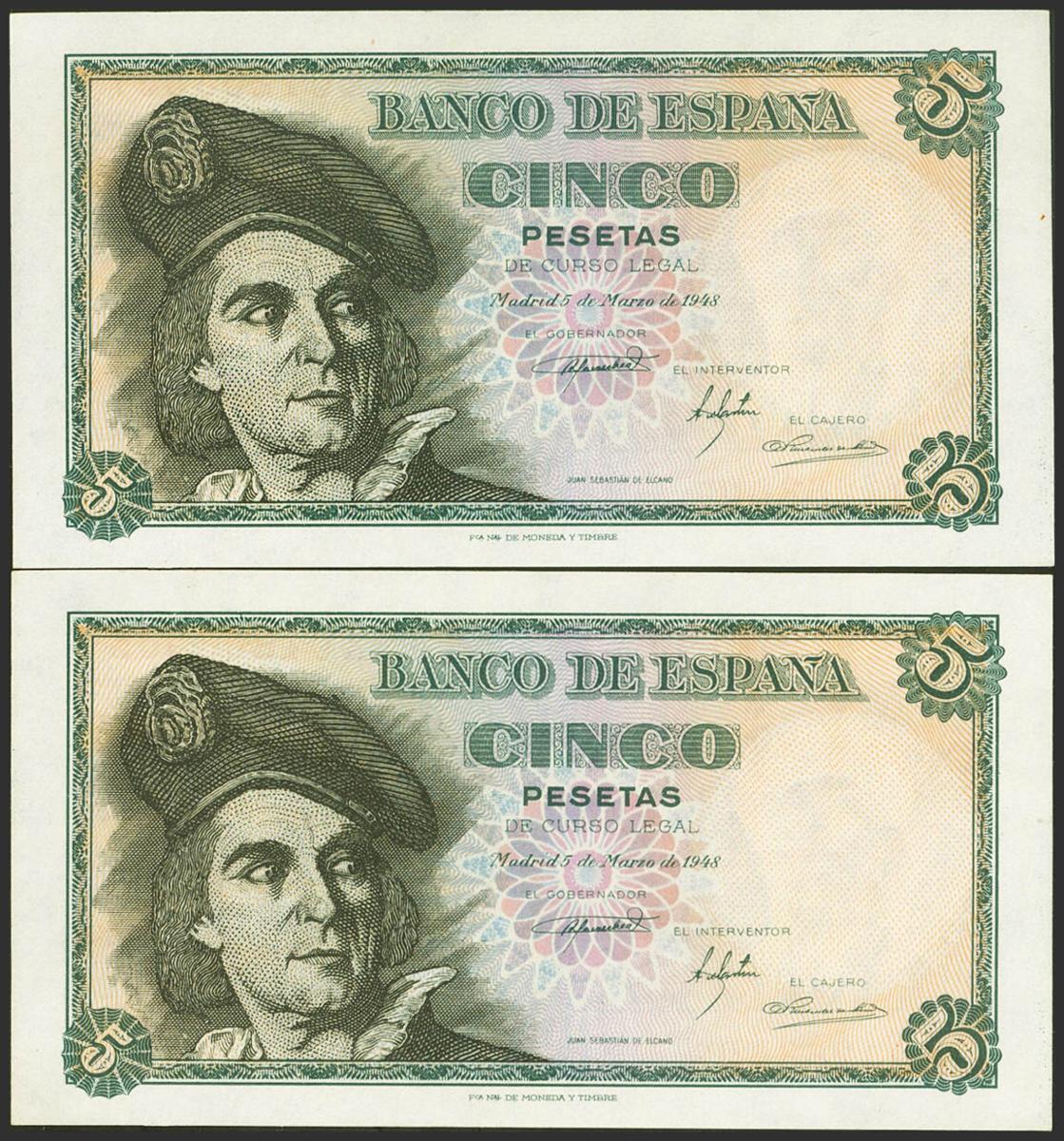5 Pesetas. March 5, 1948. Correlative couple. Series A. (Edifil 2021: 455a). Original sizing. Uncirculated.