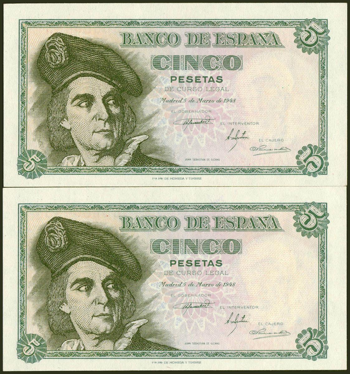 5 Pesetas. March 5, 1948. Correlative couple. Series B. (Edifil 2021: 455a). Original sizing. Almost Uncirculated.