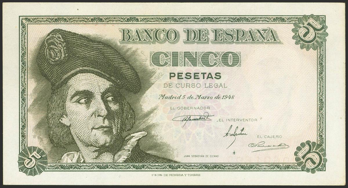 5 Pesetas. March 15, 1948. Series M. (Edifil 2021: 455a). Original sizing. Almost Uncirculated.