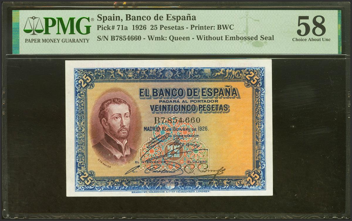25 Pesetas. October 12, 1926. Series B, last series issued. (Edifil 2021: 325a, Pick: 71a). Unusual in this quality. EBC++. PMG58 encapsulation.