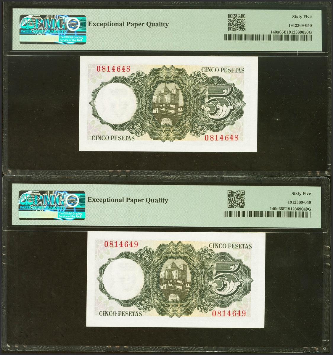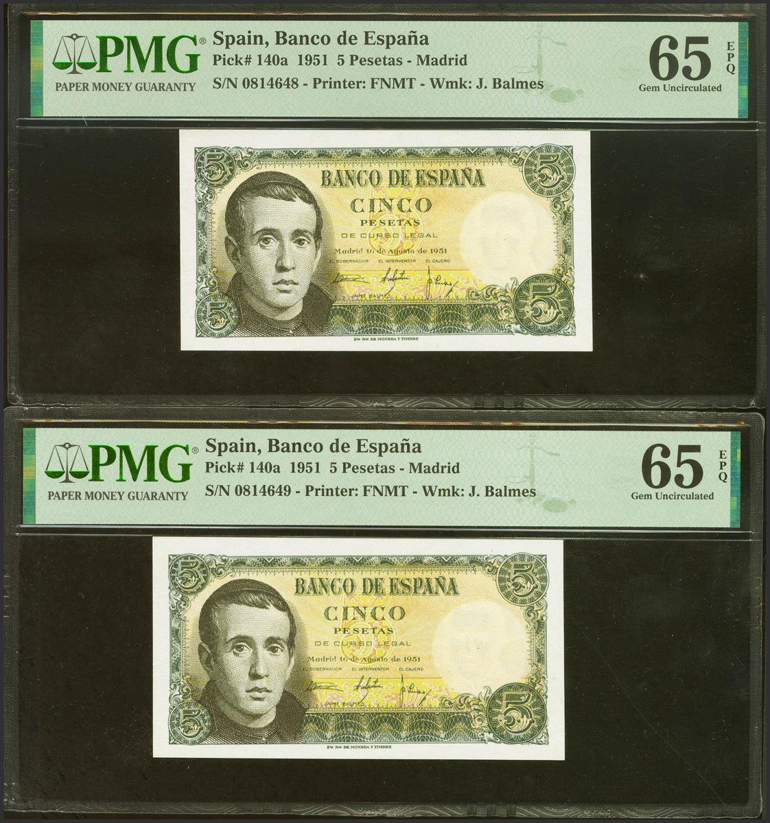 5 Pesetas. August 16, 1951. Correlative couple. No serie. (Edifil 2021: 459, Pick: 140a). Unusual in this quality, original sizing. Uncirculated. PMG65EPQ encapsulated, both.