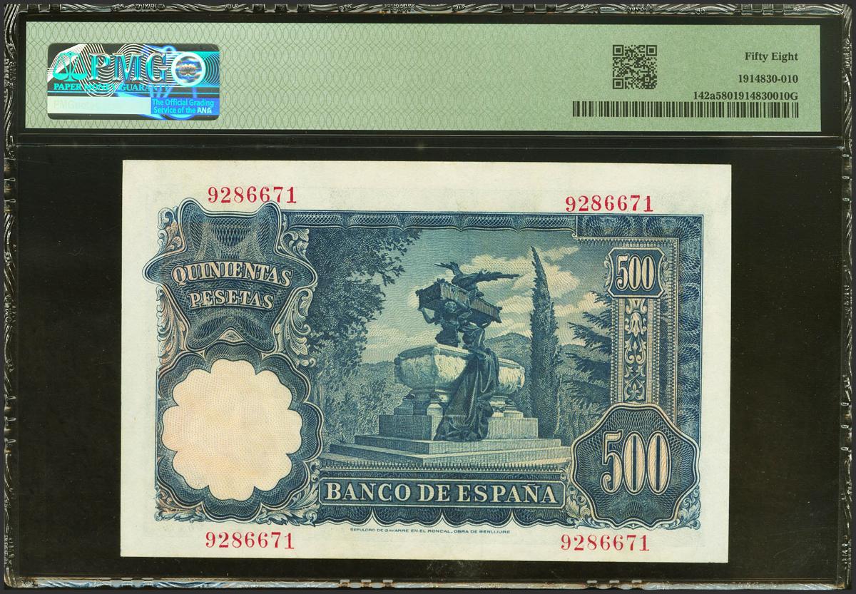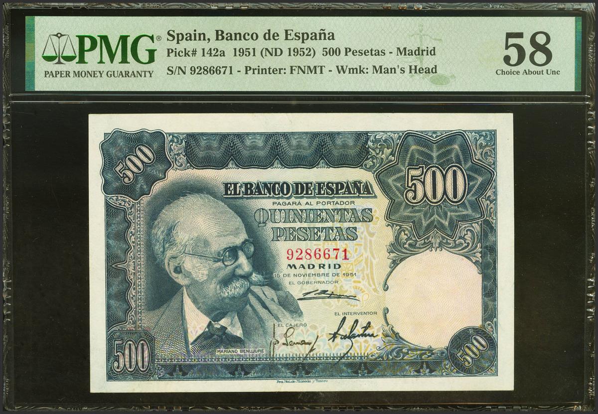 500 Pesetas. November 15, 1951. No series. (Edifil 2021: 460, Pick: 142a). Good Extremely Fine. PMG58+ package.