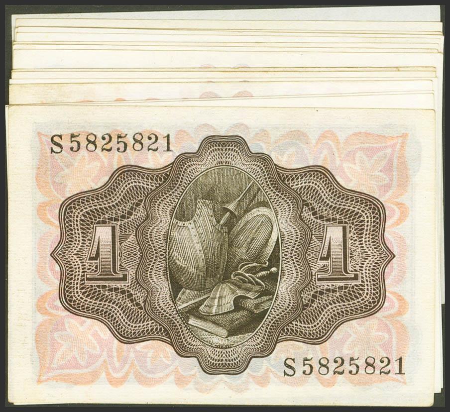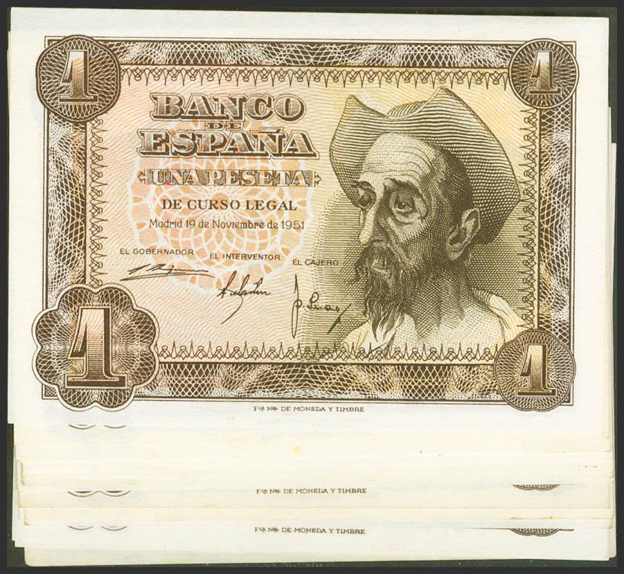 Set of 15 1 Peseta banknotes, issued on November 19, 1951, with the series A, B, C, D, E, F, G, H, I, J, K, M, P, Q and S, respectively (Edifil 2021: 461a), preserving its original preparation. Uncirculated/ Almost Uncirculated-.