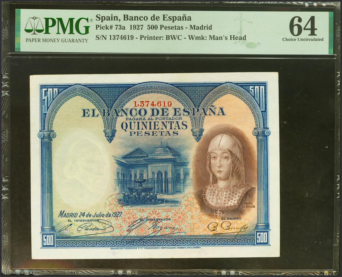 500 Pesetas. July 24, 1927. No series and numbering prior to 1602000. (Edifil 2021: 327, Pick: 73a). Very rare in this quality, especially with the Alfonso XIII numbering, it retains all its original finish. Uncirculated. PMG64 encapsulation.