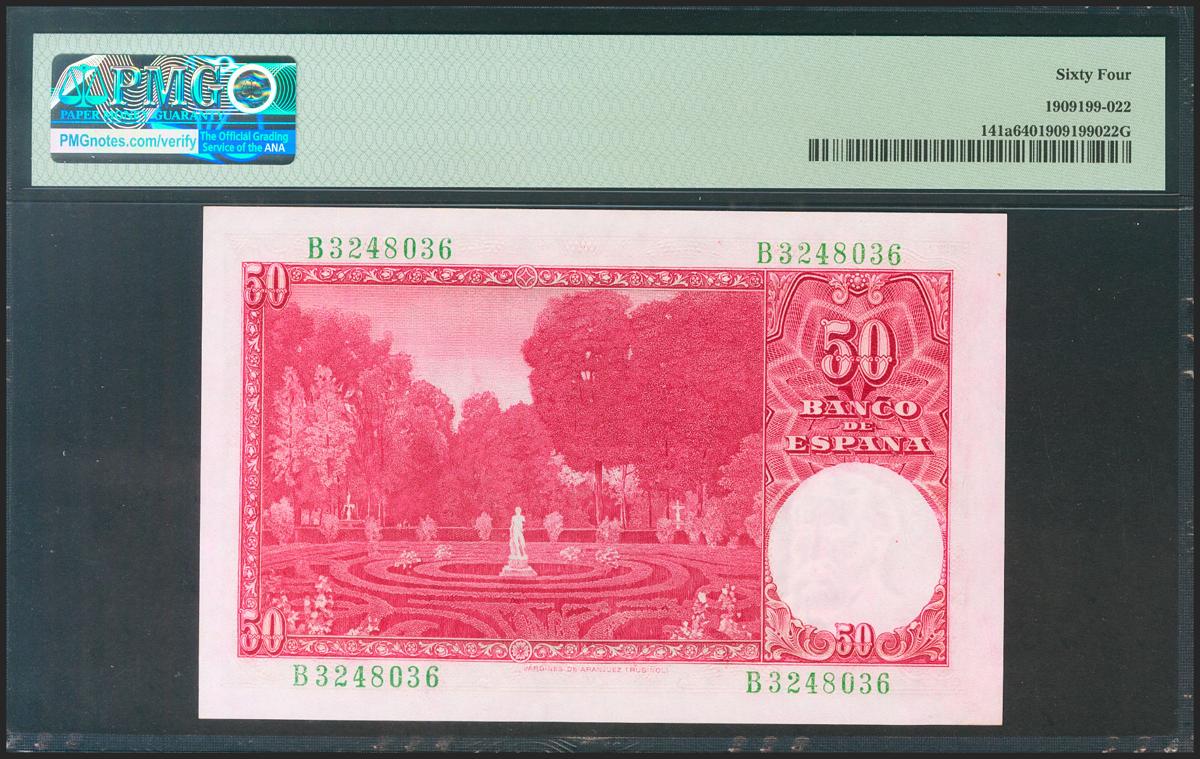 50 Pesetas. December 31, 1951. Series B. (Edifil 2021: 462a, Pick: 141a). Unusual in this quality. Uncirculated. PMG64 encapsulation.