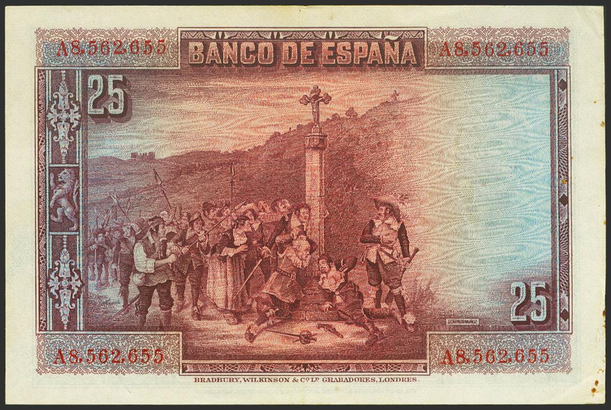 25 Pesetas. August 15, 1928. Series A and numbering greater than 7780000. (Edifil 2017: 328a). It preserves part of the original finish, points of time. Almost Extremely Fine.