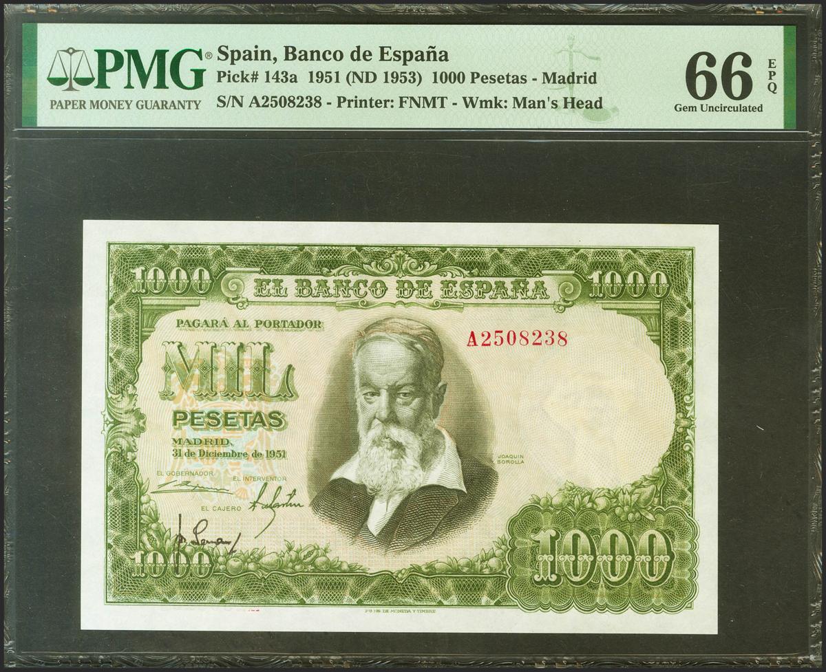 1000 Pesetas. December 31, 1951. Series A. (Edifil 2021: 463a, Pick: 143a). Rare in this exceptional quality, original sizing. Uncirculated. PMG66EPQ package.