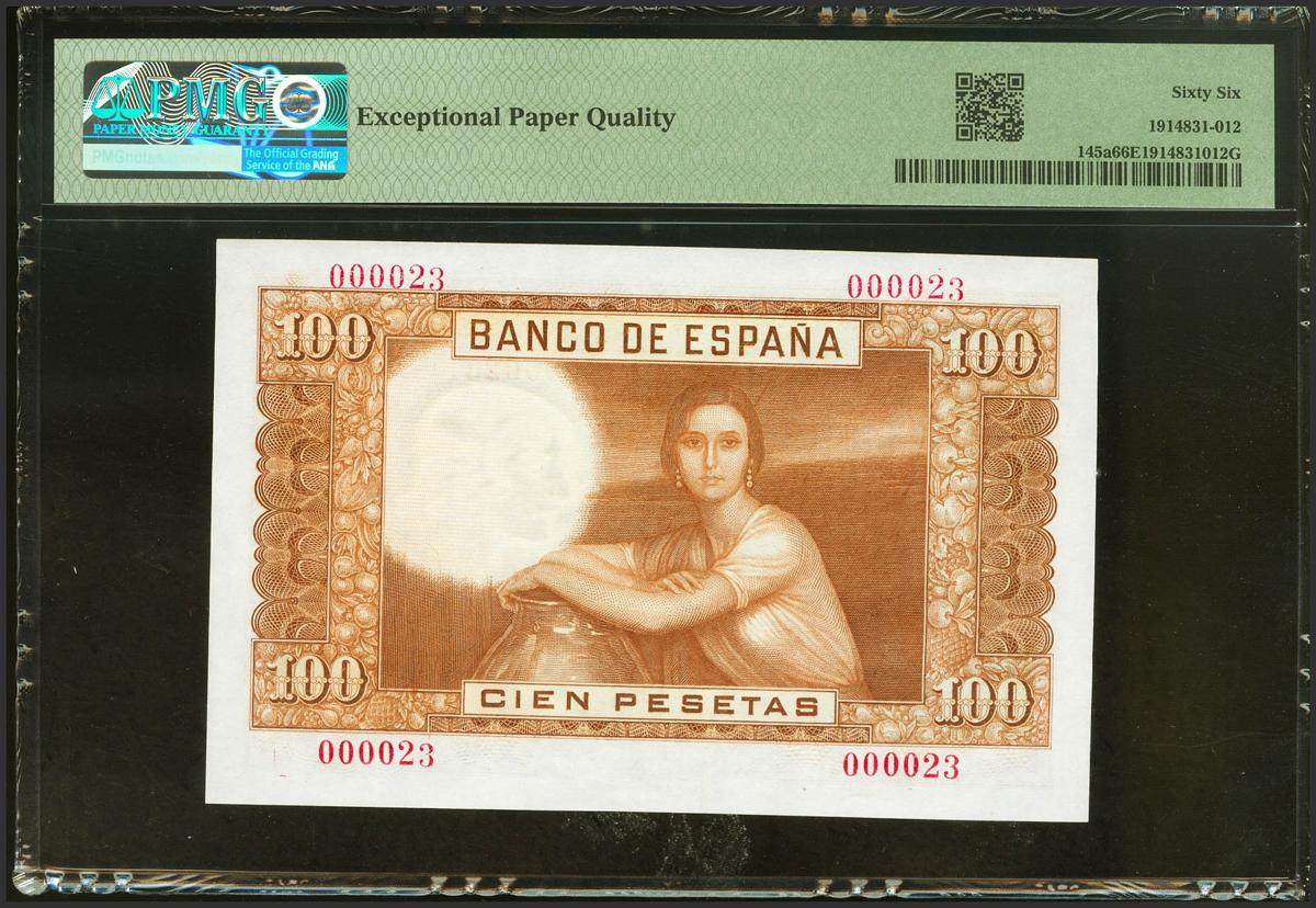 100 Pesetas. April 7, 1953. No series and extremely low numbering (000023). (Edifil 2021: 464). Very rare with a number like this and especially in this exceptional quality, it retains all its original finish. Uncirculated. PMG66EPQ package.