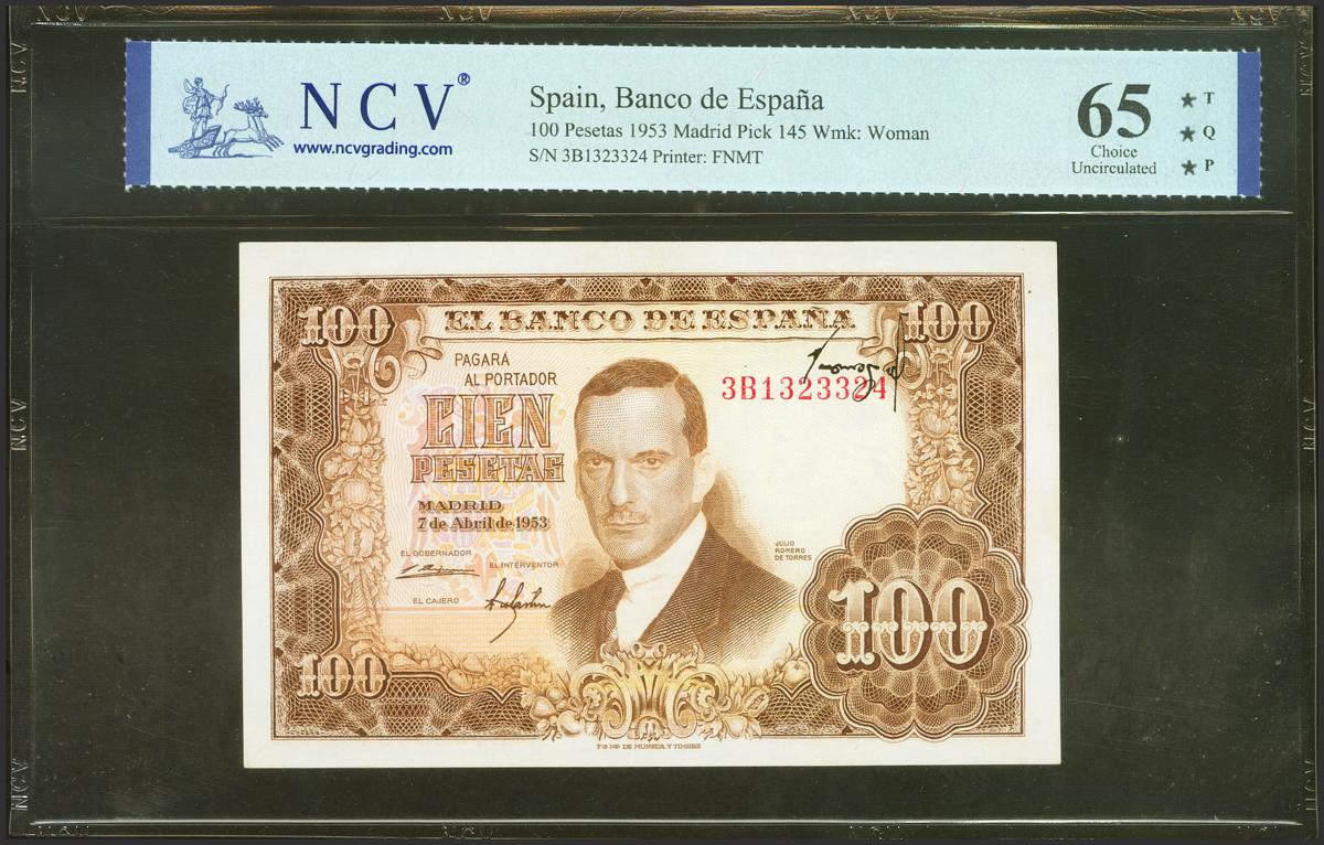 100 Pesetas. April 7, 1953. Error cashier's signature inverted and printed in the upper right. 3K series. (Edifil 2021: 464c, Pick: 145a). Unusual, original sizing. Uncirculated. NCV65TQP package.