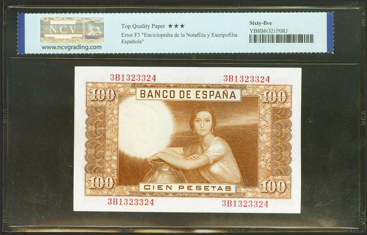 100 Pesetas. April 7, 1953. Error cashier's signature inverted and printed in the upper right. 3K series. (Edifil 2021: 464c, Pick: 145a). Unusual, original sizing. Uncirculated. NCV65TQP package.