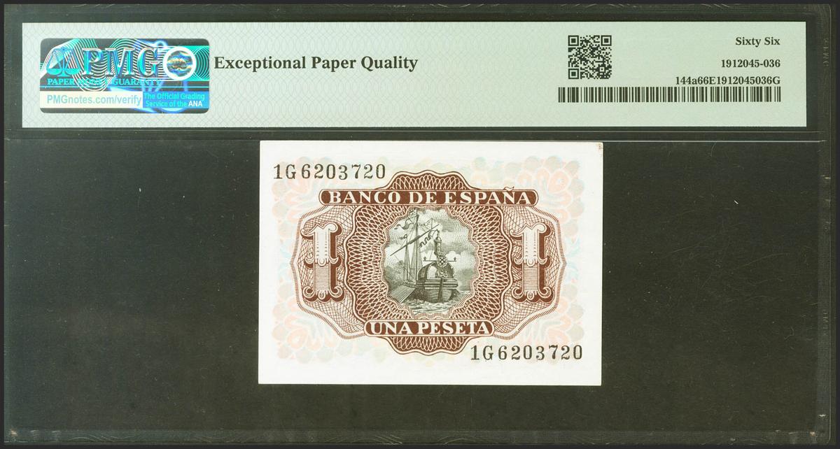 1 Peseta. July 22, 1953. Series 1G. (Edifil 2021: 465a, Pick: 144a). Unusual in this exceptional quality, original sizing. Uncirculated. PMG66EPQ package.
