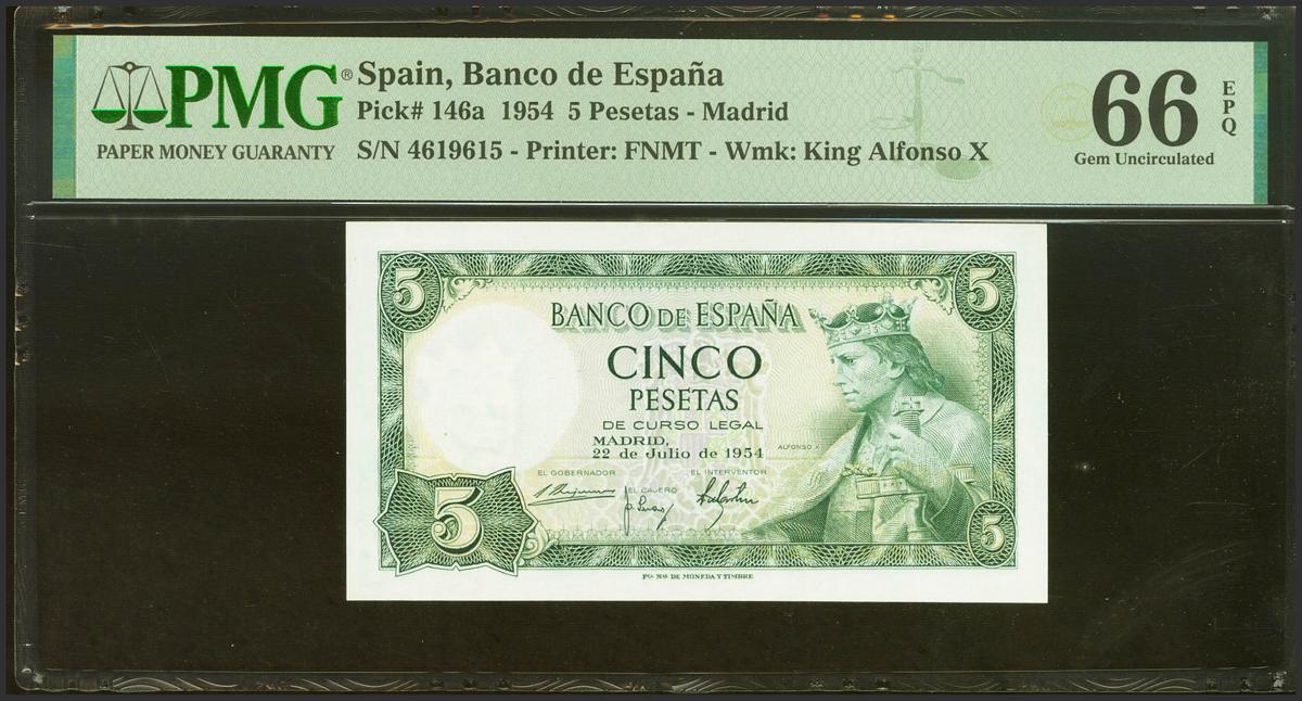 5 Pesetas. July 22, 1954. No series. (Edifil 2021: 466, Pick: 146a). Rare in this quality, original finish. Uncirculated. PMG66EPQ package.