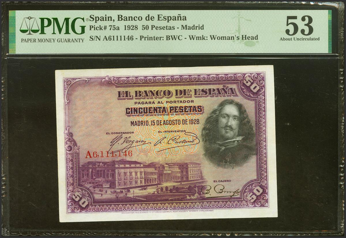 50 Pesetas. August 15, 1928. Series A and numbering prior to 7,780,000. (Edifil 2021: 329a, Pick: 75a). Extremely Fine. PMG53 encapsulation.