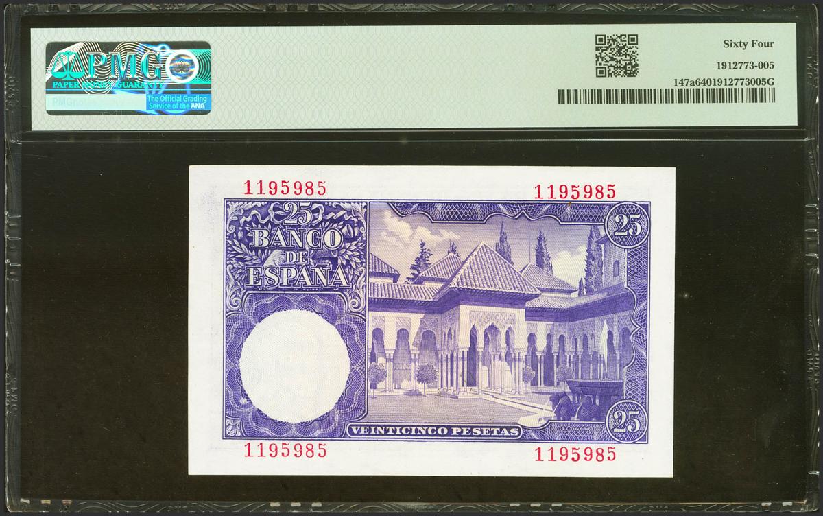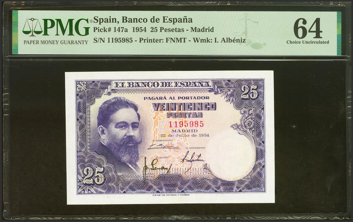 25 Pesetas. July 22, 1954. No series. (Edifil 2021: 467, Pick: 147a). Unusual. Uncirculated. PMG64 encapsulation.