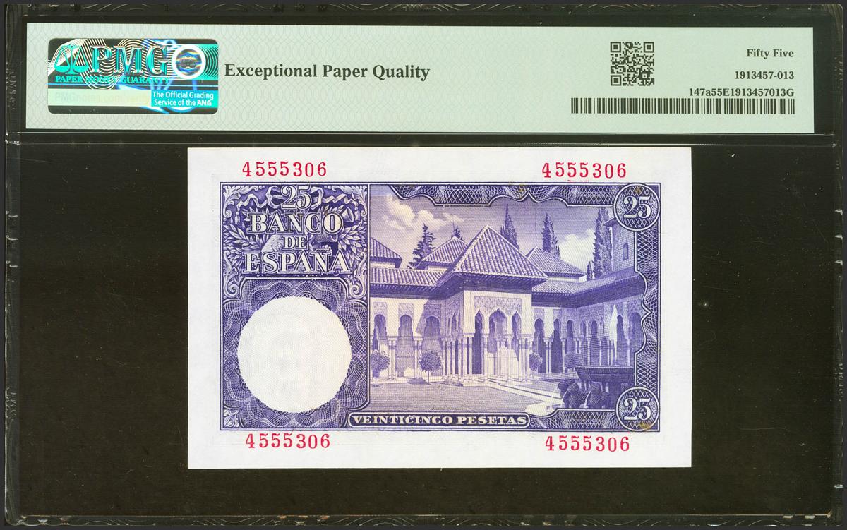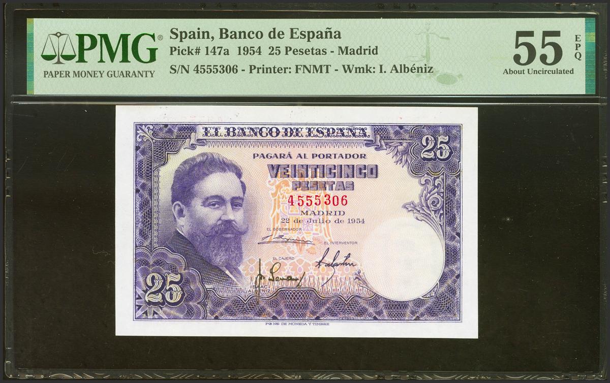 25 Pesetas. July 22, 1954. No series. (Edifil 2021: 467, Pick: 147a). Original sizing. Good Extremely Fine. PMG55EPQ package.