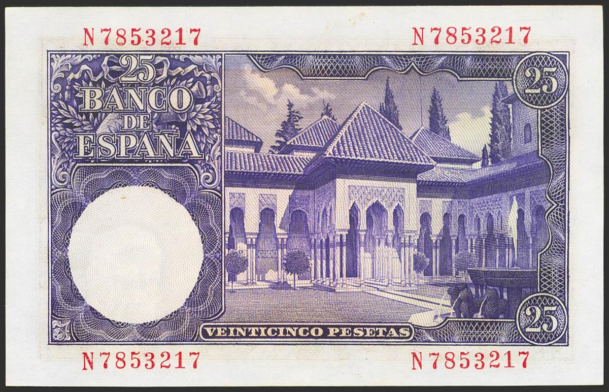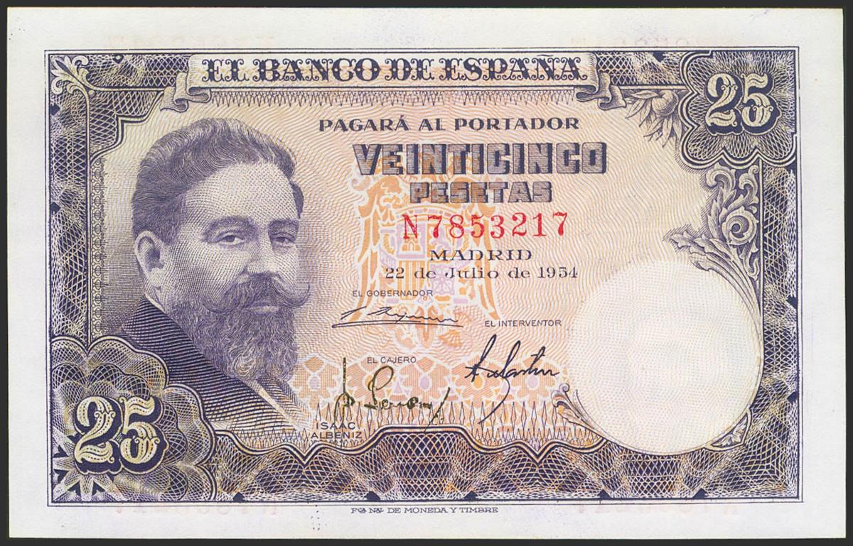 25 Pesetas. July 22, 1954. Series N. (Edifil 2021: 467a). Original sizing. Uncirculated.