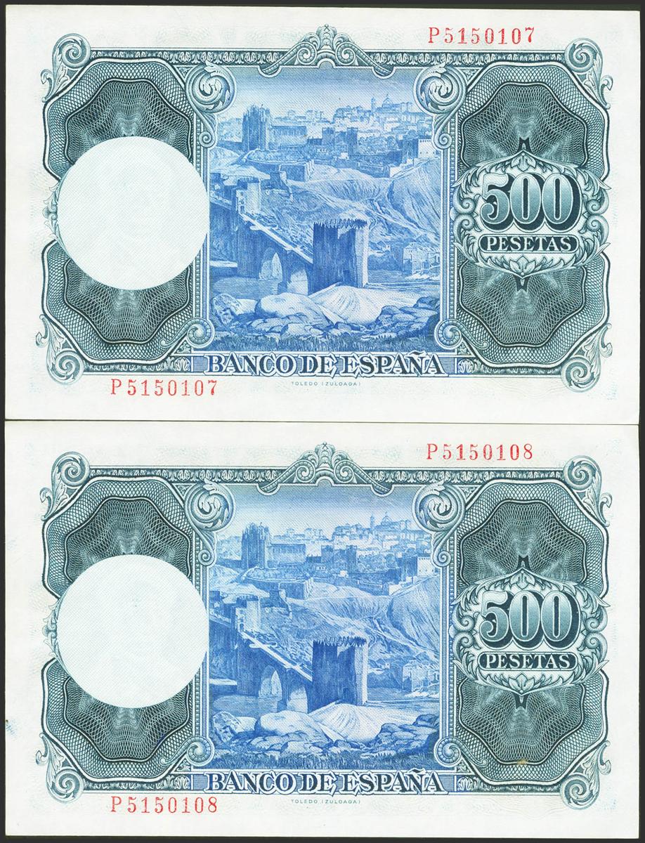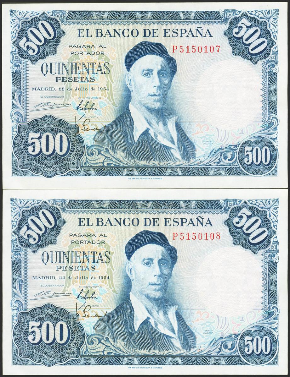 500 Pesetas. July 22, 1954. Correlative couple. Series P. (Edifil 2017: 468b). It retains all its original finish. Uncirculated.