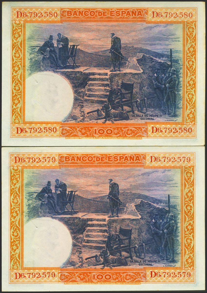 100 Pesetas. July 1, 1925. Correlative couple. Series D. (Edifil 2021: 350). It retains all its original finish. Almost Uncirculated-.