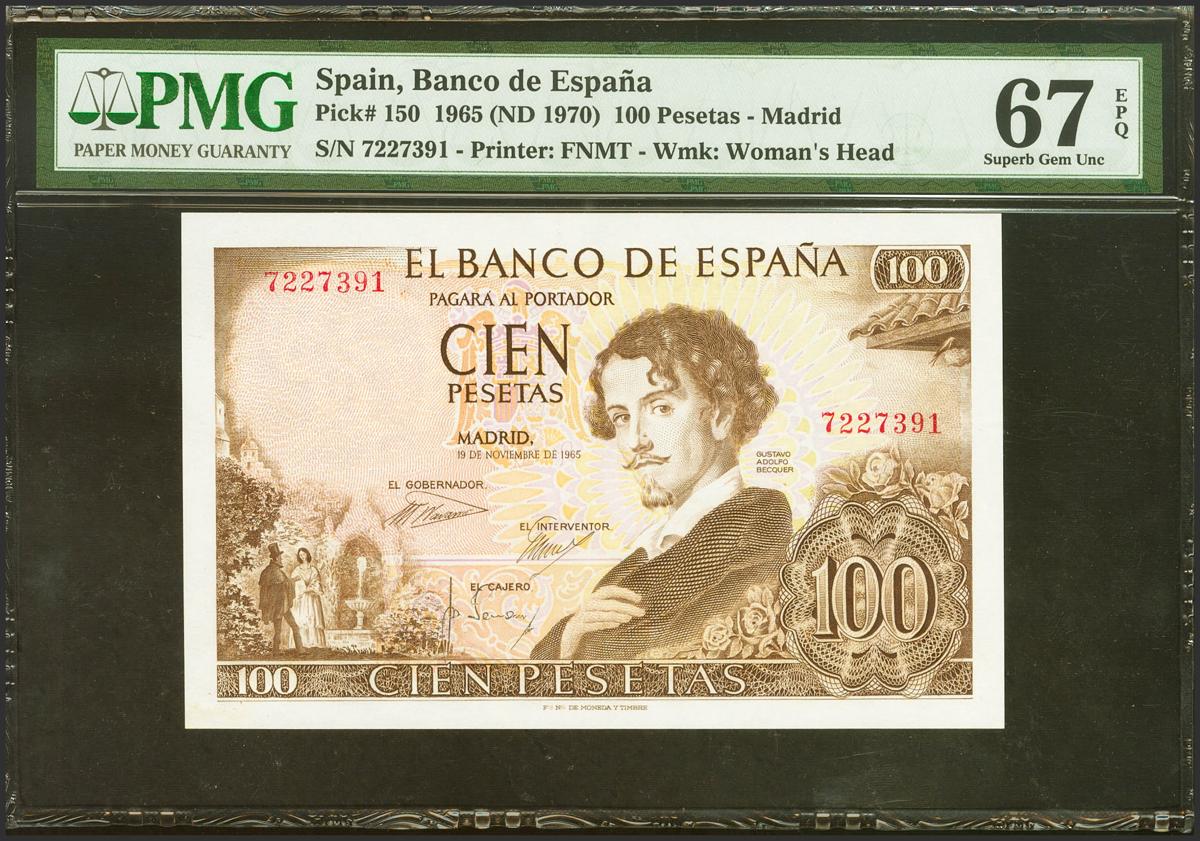 100 Pesetas. November 19, 1965. No series. (Edifil 2021: 470, Pick: 150). Original sizing. Uncirculated. PMG67EPQ package.