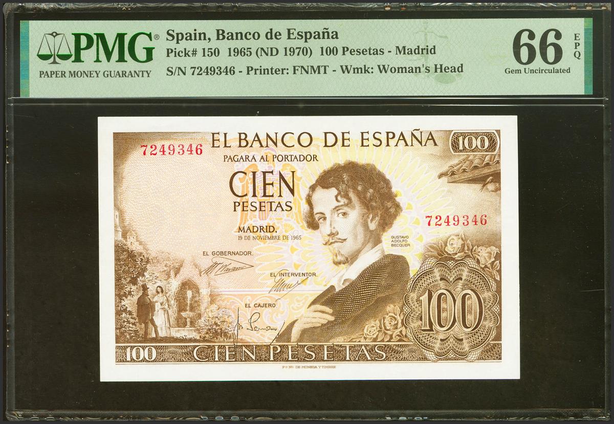 100 Pesetas. November 19, 1965. No series. (Edifil 2021: 470, Pick: 150). Unusual in this exceptional quality, original sizing. Uncirculated. PMG66EPQ package.
