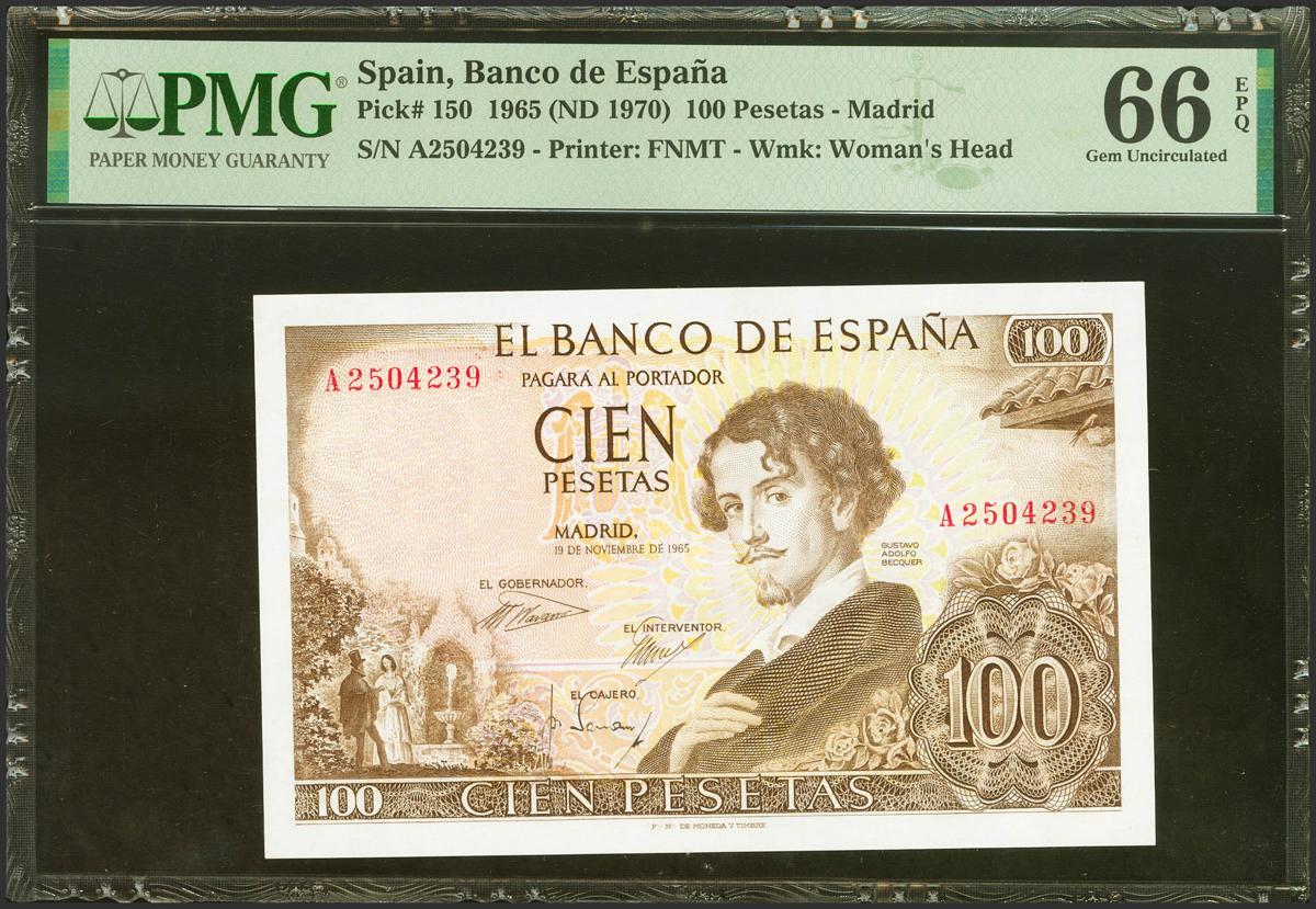 English 100 Pesetas. November 19, 1965. Series A. (Edifil 2021: 470a, Pick: 150). Unusual in this exceptional quality, original sizing. PMG66EPQ package.