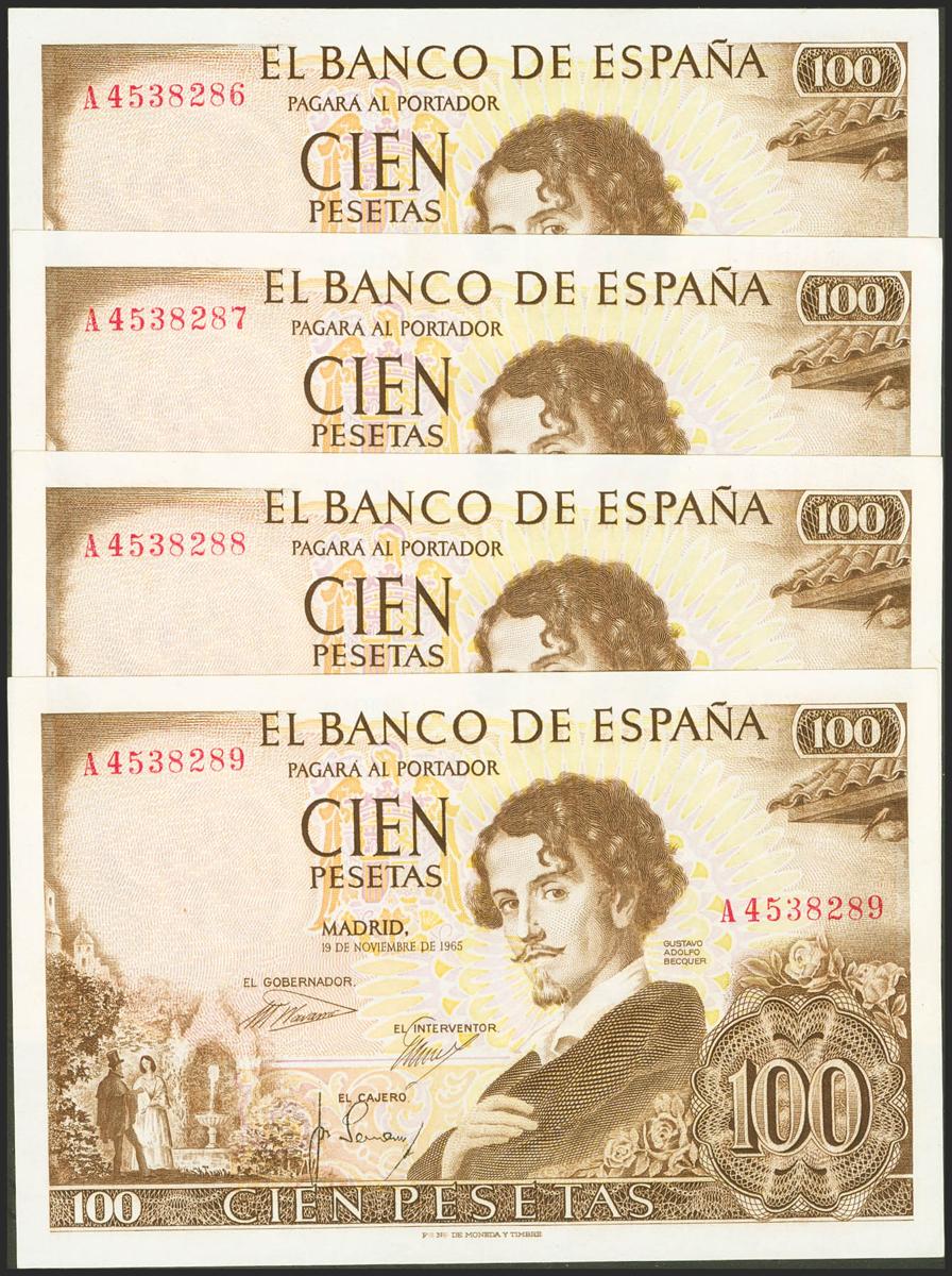 Set of 4 correlative 100 Pesetas banknotes issued on November 19, 1965, all of them with series A (Edifil 2021: 470a), preserving the original sizing. Uncirculated/ Almost Uncirculated.