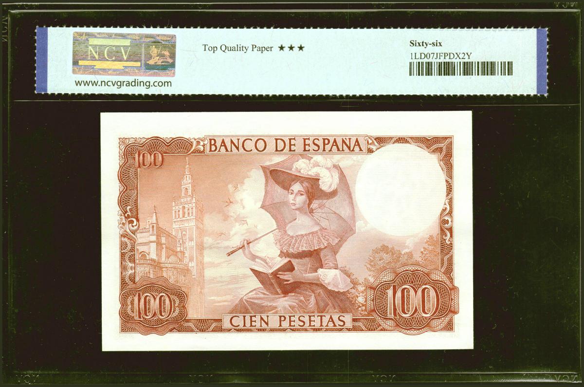 100 Pesetas. November 19, 1965. Series B. (Edifil 2021: 470a, Pick: 150). Rare in this exceptional quality, original sizing. NCV66TQP package.