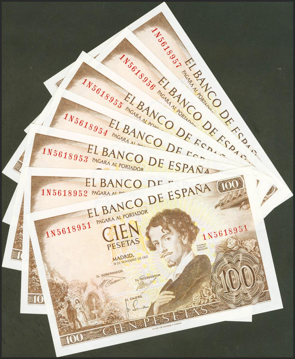 Set of 7 correlative 100 Pesetas banknotes issued on November 19, 1965, all of them with the 1N series (Edifil 2021: 470a), preserving the original sizing. Almost Uncirculated.