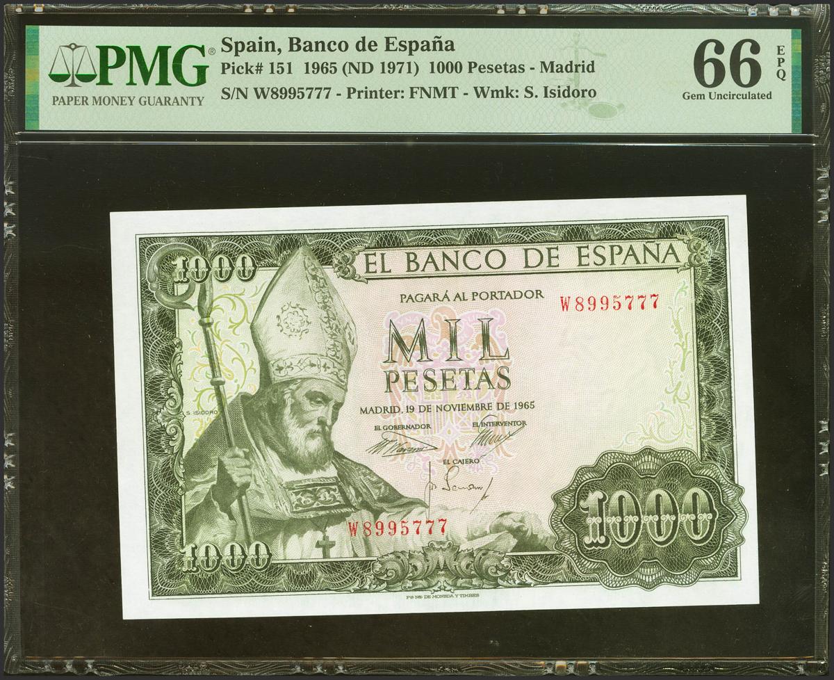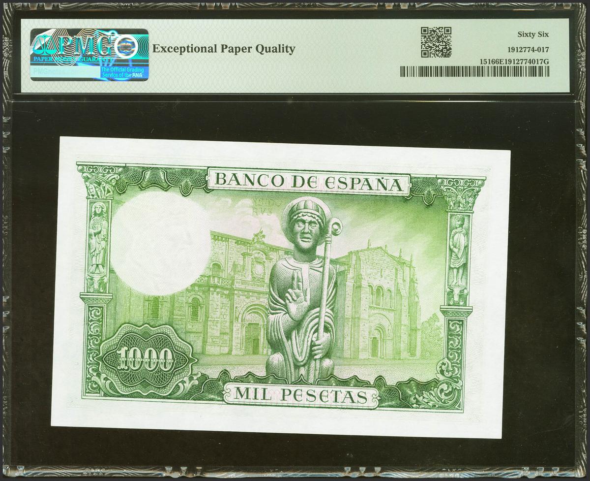 1000 Pesetas. November 19, 1965. Series W. (Edifil 2021: 471b, Pick: 151). Very rare in this exceptional quality, original sizing. Uncirculated. PMG66EPQ package.