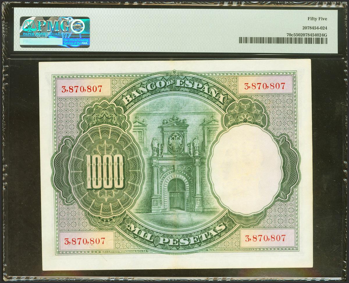 1000 Pesetas. July 1, 1925. Without series and numbering after 3646000. (Edifil 2021: 351, Pick: 70c). Unusual in this quality. Good Extremely Fine. PMG55 encapsulation.