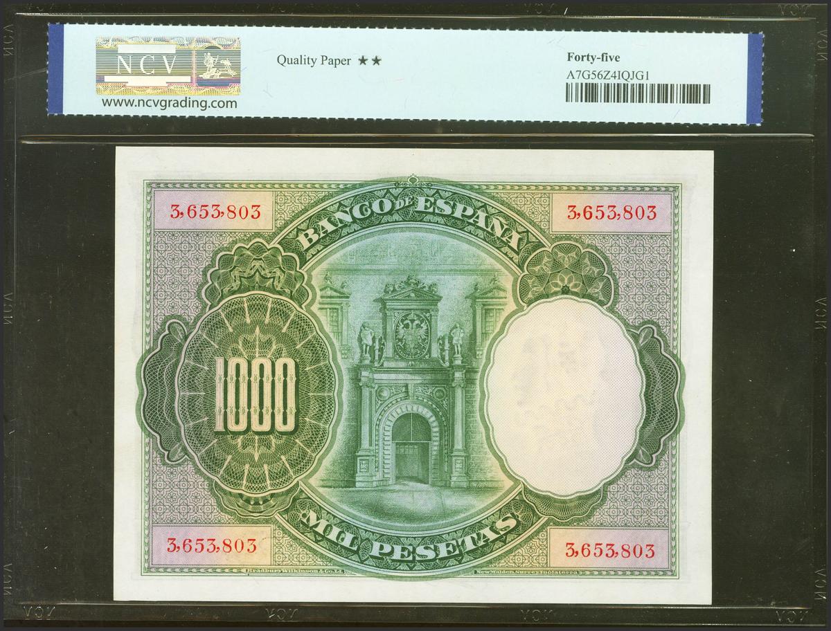 English 1000 Pesetas. July 1, 1925. Without series and numbering after 3646000. (Edifil 2021: 351, Pick: 70c). Unusual in this quality. Almost Extremely Fine. NCV45 encapsulation.