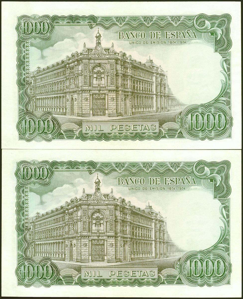 1000 Pesetas. September 17, 1971. Correlative couple. Special series 9A. (Edifil 2021: 474d). It retains all of its original finish, one of them has some age stains. Almost Uncirculated-.