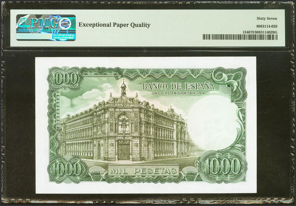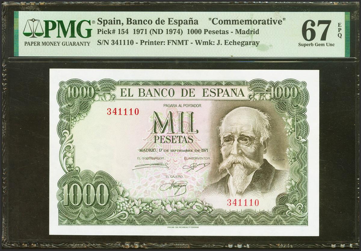 English 1000 Pesetas. September 17, 1971. No series. (Edifil 2021: 474, Pick: 154). Unusual in this quality, original sizing. PMG67EPQ package.