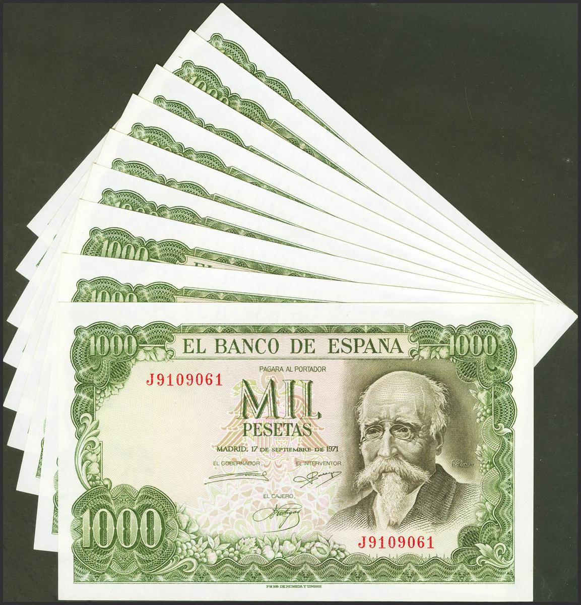 Set of 9 correlative 1000 Pesetas banknotes issued on September 17, 1971, all of them with the J series (Edifil 2021: 474c), preserving their original size. Uncirculated.