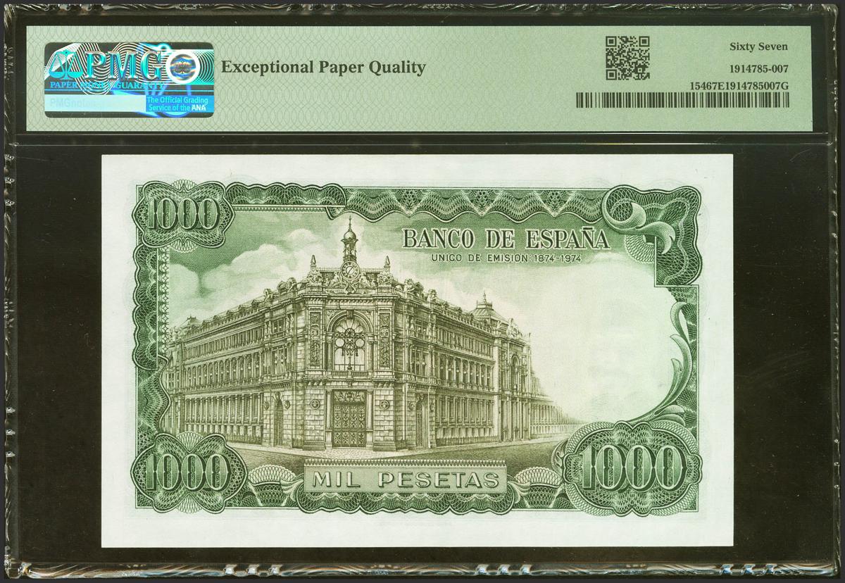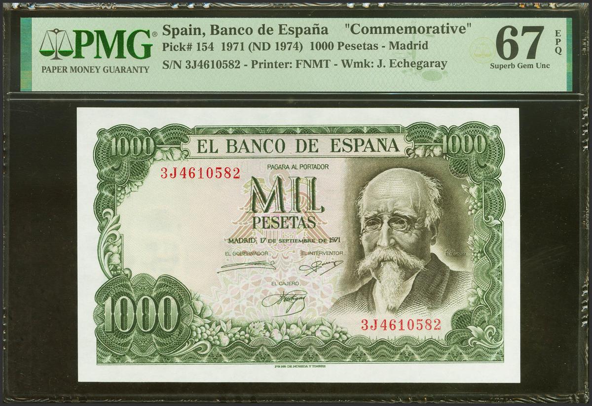 1000 Pesetas. September 17, 1971. Series 3J. (Edifil 2021: 474c, Pick: 154). Rare in this exceptional quality, original sizing. Uncirculated. PMG67EPQ package.