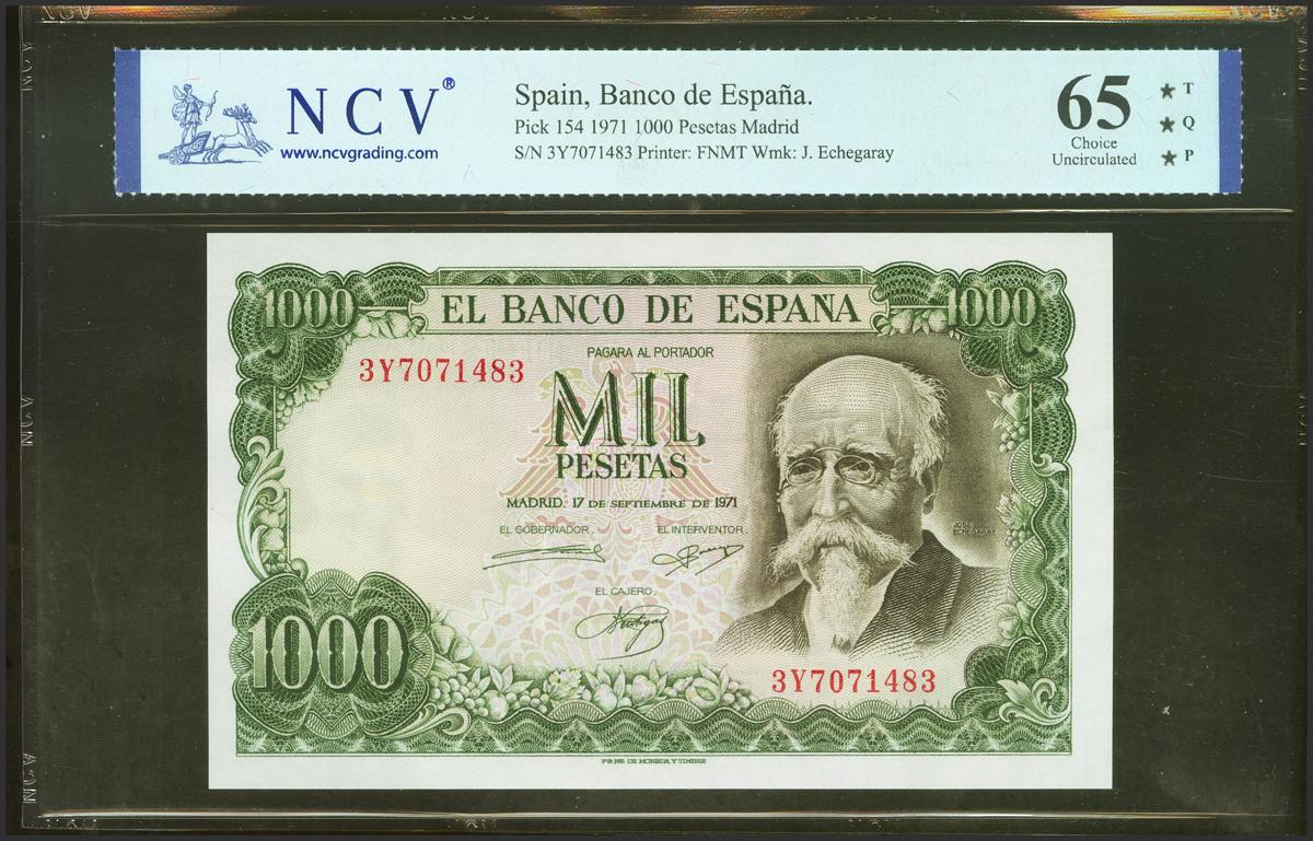 English 1000 Pesetas. September 17, 1971. Series 3Y. (Edifil 2021: 474c, Pick: 154). Unusual in this quality, original sizing. Uncirculated. NCV65TQP package.